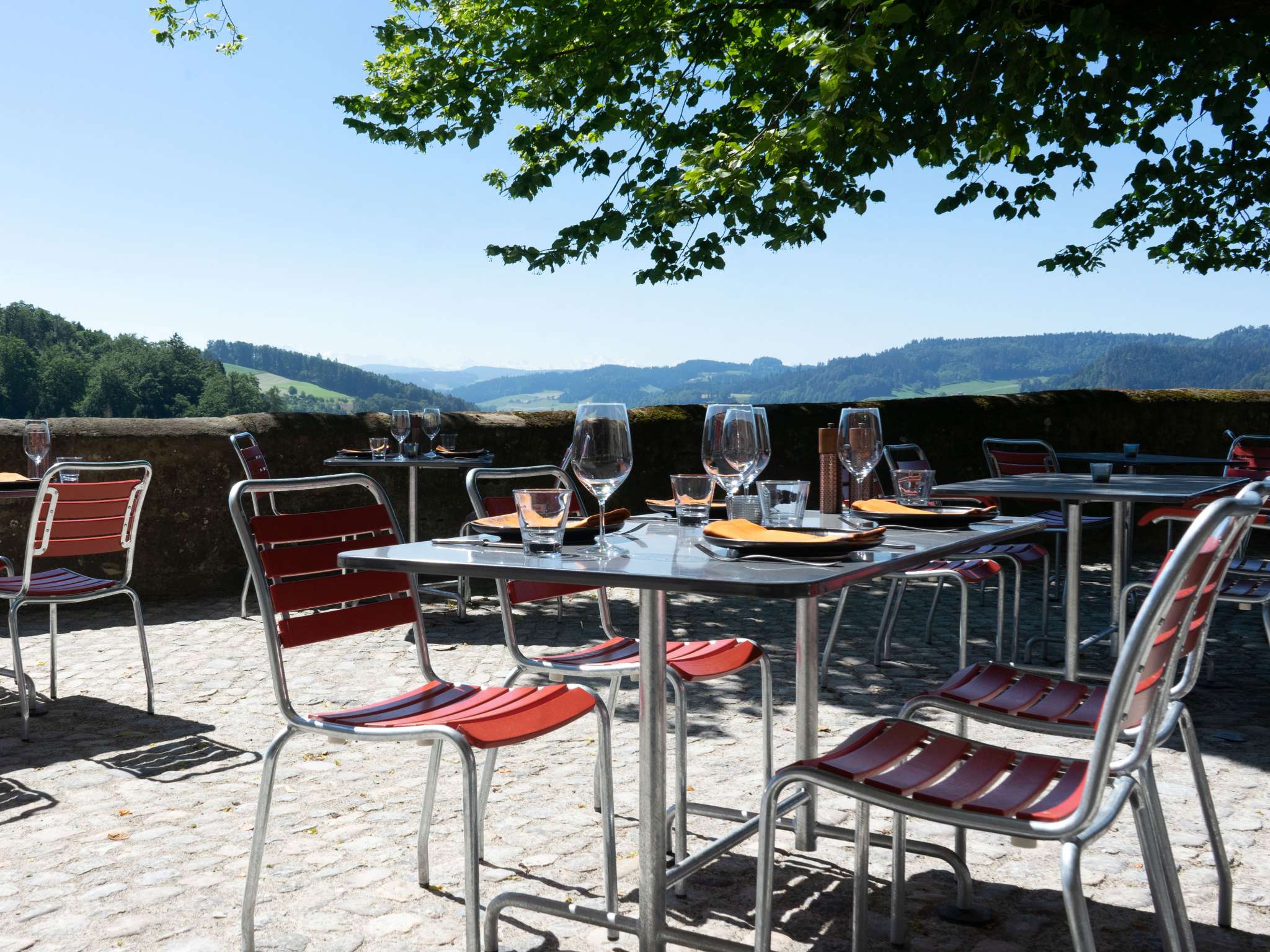 Das Restaurant zwischen alten Mauern verwöhnt seine Gäste von morgens bis abends mit regionaler Küche. Die Terrasse mit grossartigem Blick auf das Emmental bringt Leben in den Schlosshof und mit dem Assisensaal steht eine charmante Festlokalität zur Verfügung.